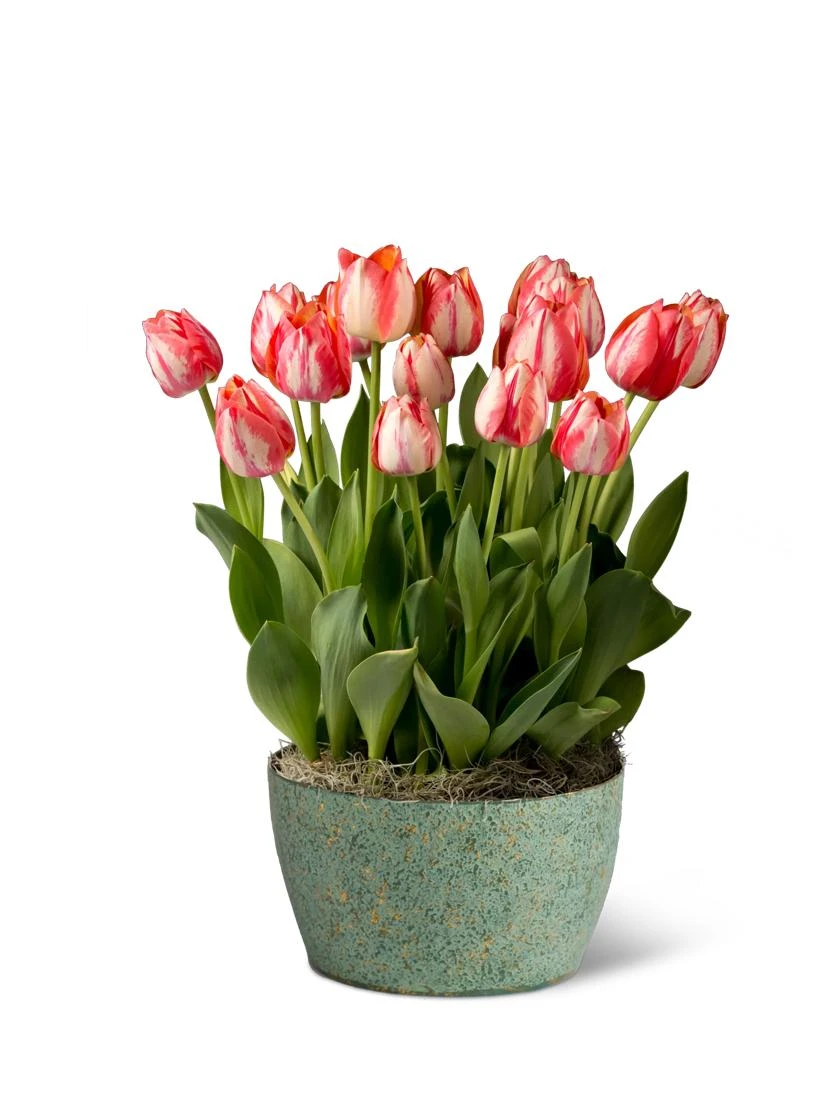 Celebrate your love with this simple yet stunning bulb garden.Ā 18 beautiful ‘Spryng Break’ tulips displayed in a 10.5″ reusable metal cachepot, burst into bloom with petals of rich cream lined with luscious pink-red flames. With weeks of blooms to keep your sweetheart thinking of you, these bulbs will begin their lovely show in about three weeks.